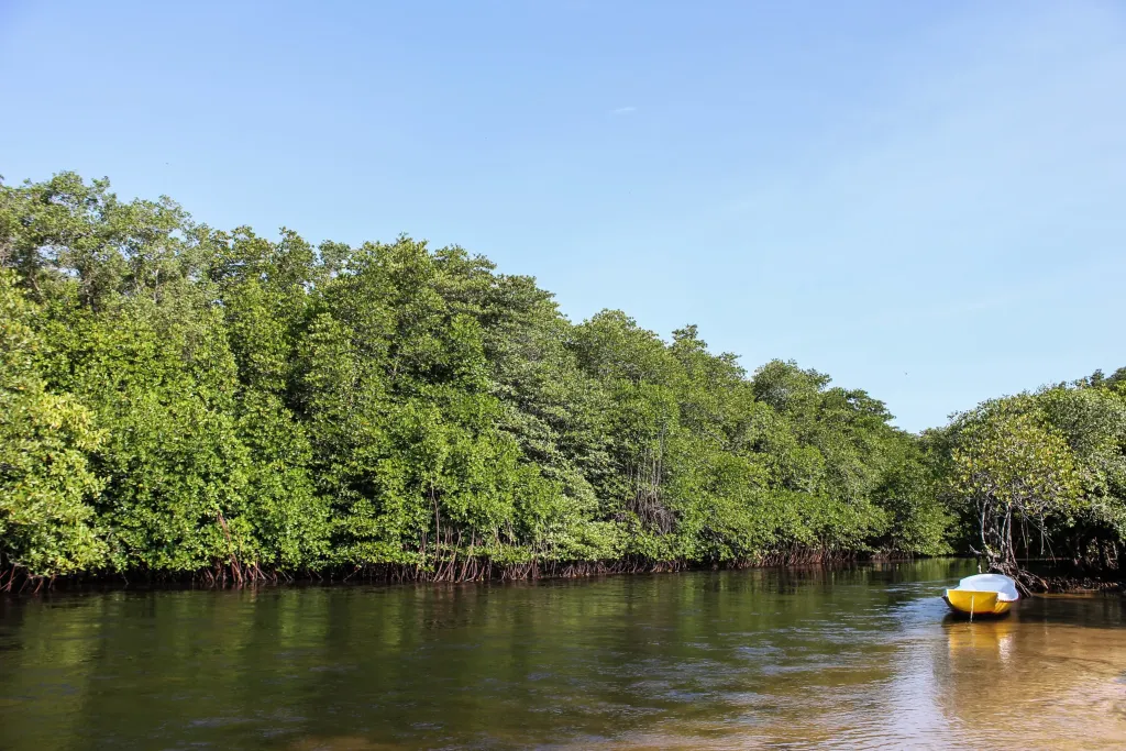 El agua de los manglares proporciona una zona de cría favorita para los camarones. Sin embargo, los manglares de Indonesia se veían como un inconveniente para los pescadores, lo que llevó a su eliminación progresiva para sustituirlos por criaderos de camarones. Sin las raíces de los manglares que filtran el agua, los monocultivos de camarones requerían un montón de productos químicos para mantener el agua «limpia». Dado que el pienso es caro, y casi todo importado, los criadores de camarones buscaron maneras de recortar costes. Alimentar a los camarones con sus propios desechos funcionó durante un tiempo, hasta que el ataque devastador del virus de la mancha blanca arruinó el negocio. Esto motivó que la Universidad Politécnica de Yakarta empezara a investigar soluciones mejores. La universidad adquirió un terreno baldío a lo largo de la costa de la isla de Java, cerca de la ciudad de Surabaya. Se plantaron mangles a lo largo de los difuntos esteros y canales, donde la universidad comenzó a criar camarones. El agua más saludable gracias a la presencia de los mangles atrajo a las microalgas, y un medio marino más rico en los esteros hizo posible criar también cangrejos y sabalotes, lo que a su vez permitió el cultivo de algas como clorela y espirulina.